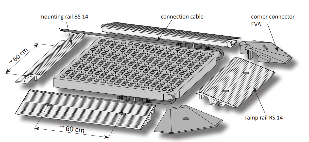 El Conector de esquina EVA RS 14 (603020) de Aso Safety, es colocado en las esquinas de las alfombras SENTIR mat para acople de rampas de los modelos 14 ARB/14TBV/14NP. Inserte el conector de esquina más cercano al cable desde arriba para guiar el cable por el conducto (Fig.1). Material: PA 6 30 % VD, negro.